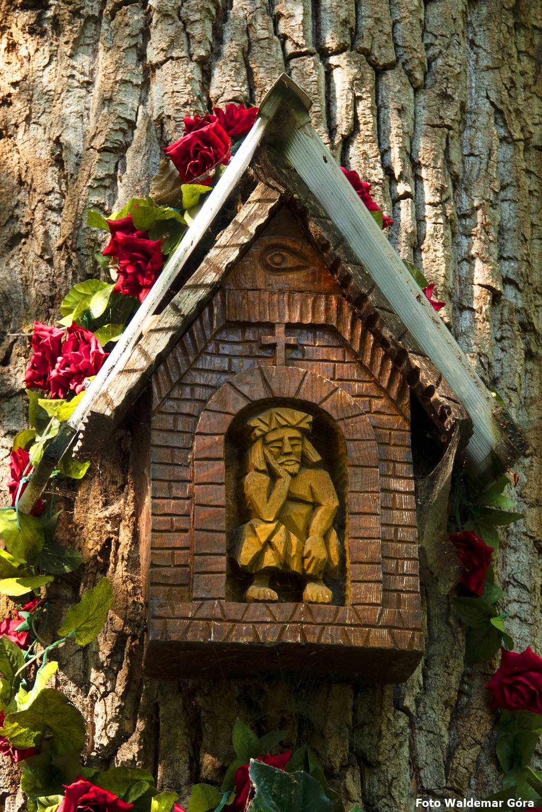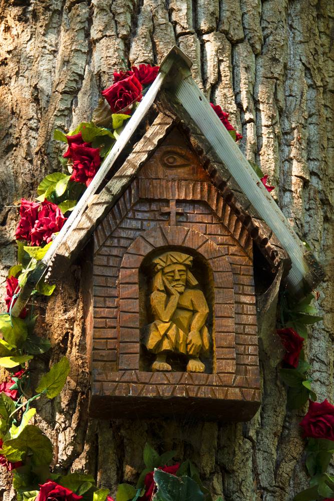 Kapliczka szafkowa z figurką Jezusa Frasobliwego