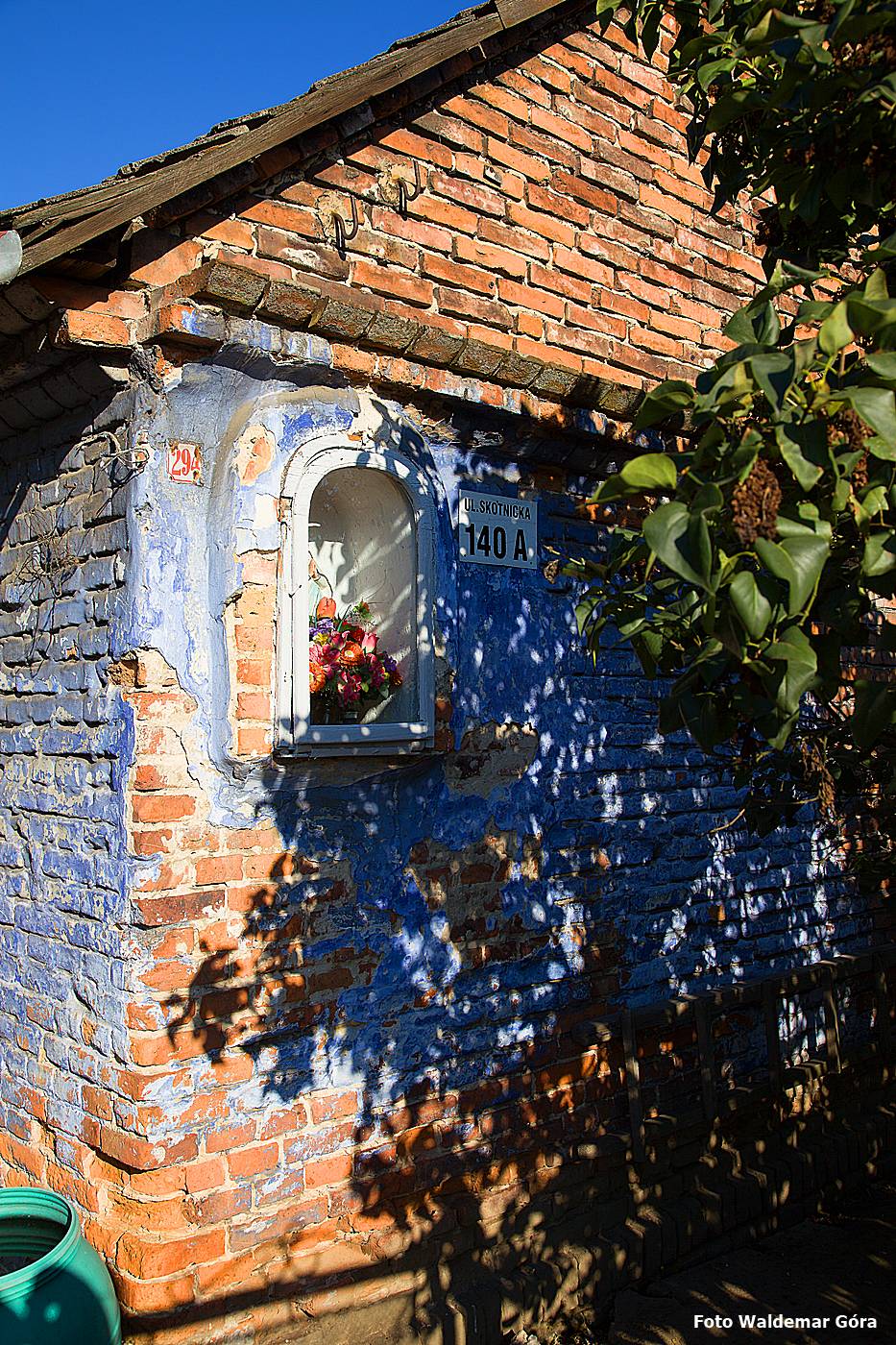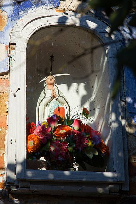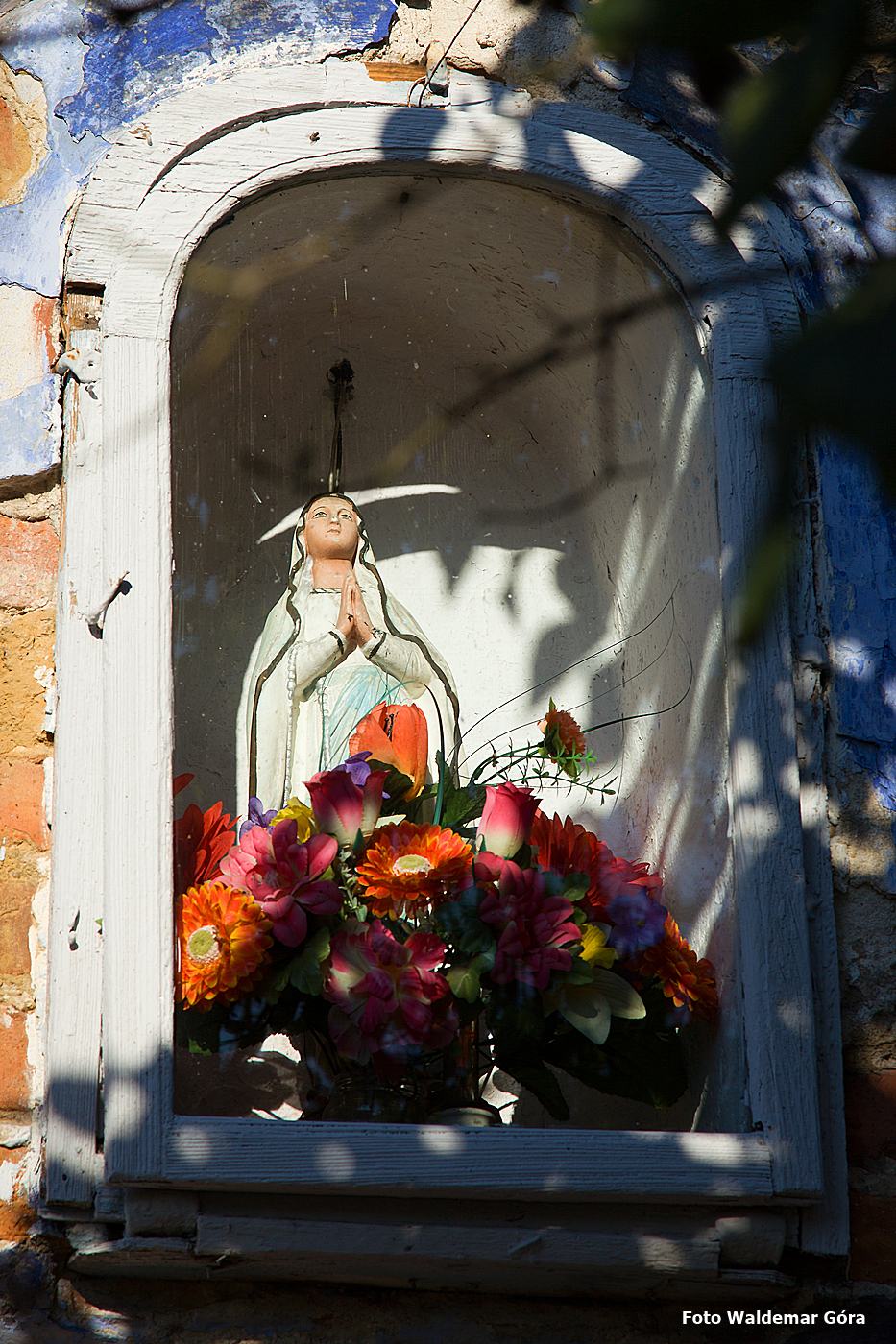 Kapliczka wnękowa w ścianie domu z figurą Matki Boskiej