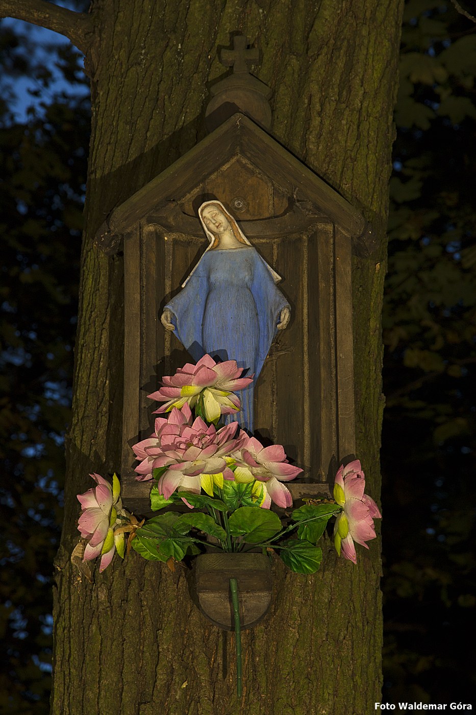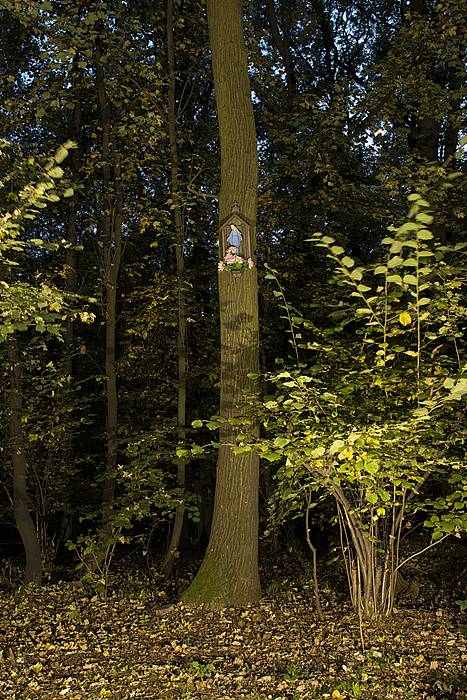Kapliczka wisząca na drzewie w lesie z figurką Matki Boskiej