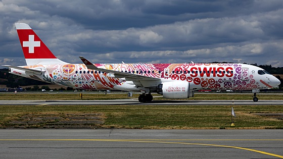 2019.07.14NOWE MALOWANIE SWISS W KRAKÓW AIRPORT11 lipca 2019 roku udało się Marcinowi uchwycić w Kraków Airport Bombardiera CS300 BD-500-1A11 szwajcarskiej linii lotniczej Swiss Global Air Lines w nowym specjalnym malowaniu "Fete des Vignerons 2019 - Fichtre". |